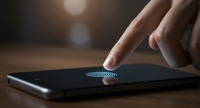 A fingerprint scanner on a smartphone screen, a modern technology for biometric security and access.Concept of digital security and biometric technology.