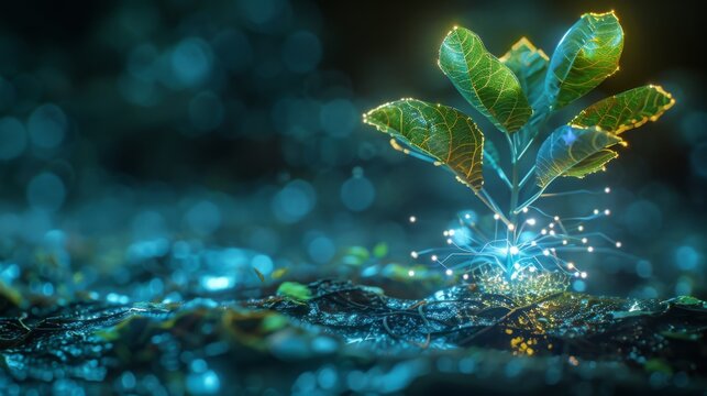 Glowing green digital plant sprouts from dark soil in an urban environment with blurred city lights in the background symbolizing technology and growth