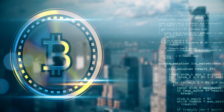 Creative glowing digital bitcoin on blurry toned city backdrop with binary coding. Virtual cryptocurrency and futuristic banking concept. Double exposure.