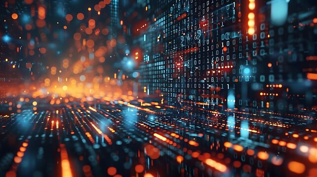 Futuristic binary code and digital blocks in virtual space