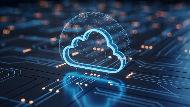 Glows with futuristic digital cloud technology, representing data connectivity and innovation on a vibrant circuit board background