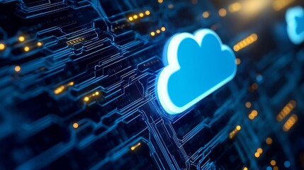 This striking digital illustration showcases a cloud symbol interconnected with intricate circuitry, surrounded by vibrant blue and orange bokeh lights