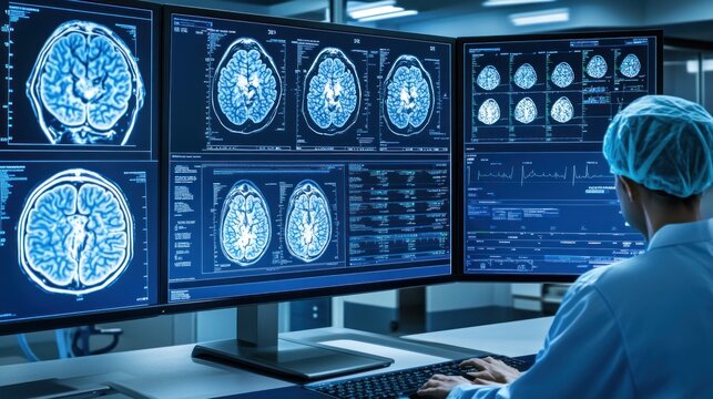 A healthcare professional reviews detailed brain scans displayed on high-resolution monitors in a contemporary medical setting during nighttime. The environment is well-lit and organized