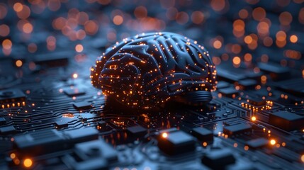 Glowing digital brain hologram surrounded by cybernetic circuitry