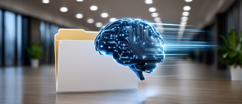Smart artificial intelligence brain transferring data and ensuring security in digital file management with glowing circuit neural pathways