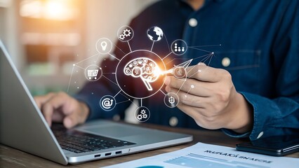 AI Technology. Businessman touching virtual digital brain with machine learning of Artificial Intelligence, data science, software development with global network connection, Business Intelligence