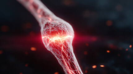 Close-up visualization of a glowing synapse transmitting an electrical signal, highlighting neural connections and intricate web-like structures in a dark, blurred background
