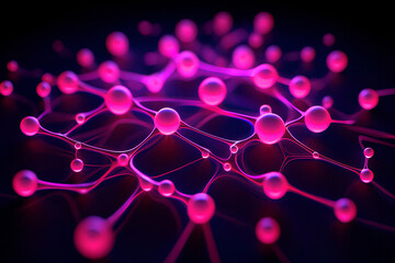 Intricate network of glowing pink spheres connected by luminous lines creating an abstract scientific molecular structure visualization representing neural pathways or complex data connections