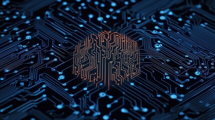 A close-up view of a circuit board design featuring intricate patterns and a brain symbol, representing the fusion of technology and artificial intelligence.