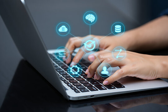 Hands typing on a laptop with connected data icons illustrating cloud computing artificial intelligence and information technology concepts
