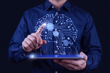 Augmented Cognition Display: Man Interacting with Brain-Shaped Digital Overlay on Tablet Representing Advanced Neural Interface and Cognitive Technology Systems with Digital Enhancements