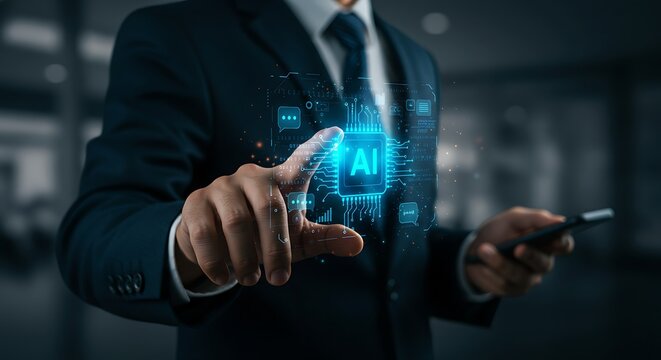 Businessman holding glowing AI brain icon with futuristic digital interface, symbolizing artificial intelligence, machine learning, data analytics, and modern innovation technology.