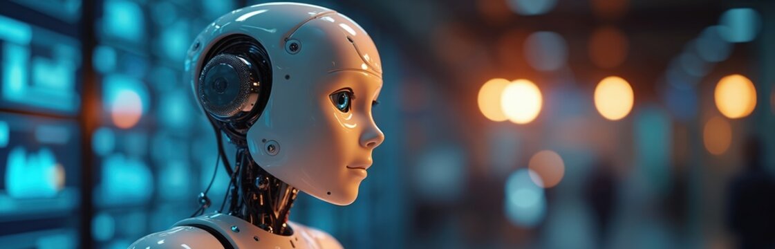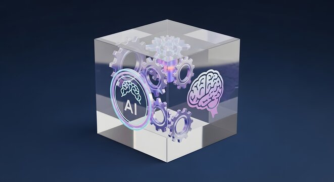 A white, robotic brain model, partially dissected to reveal glowing orange internal circuitry and a blue digital component