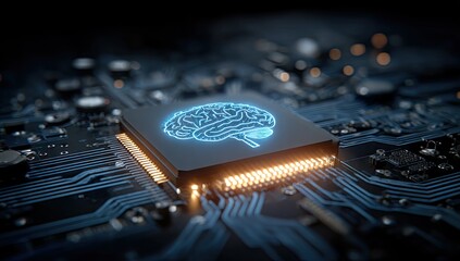 A luminous brain model sits atop a microchip, symbolizing the fusion of neuroscience and technology. The intricate details highlight advancements in artificial intelligence and computing