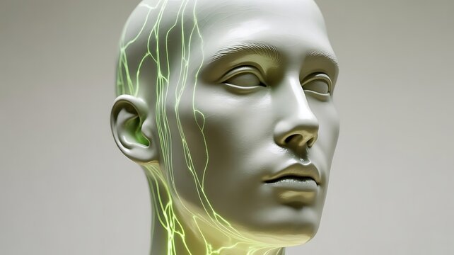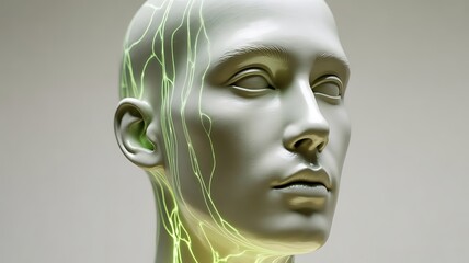Close up of a stylized human head mannequin showing glowing green neural pathways or lymphatic system highlights representing advanced medical science and futuristic biology concepts