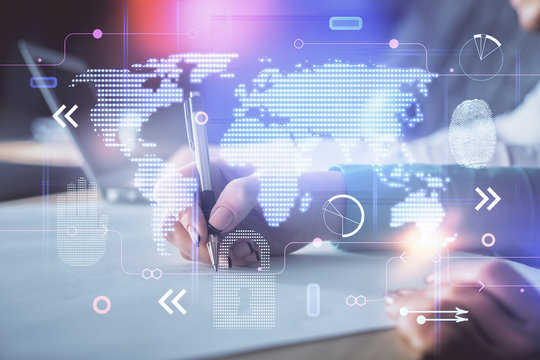 Multi exposure of man's hands typing over computer keyboard and world map hologram drawing. Top view. Technology concept.