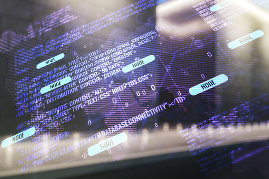 Double exposure of abstract programming language hologram and world map on modern business center exterior background, research and development concept