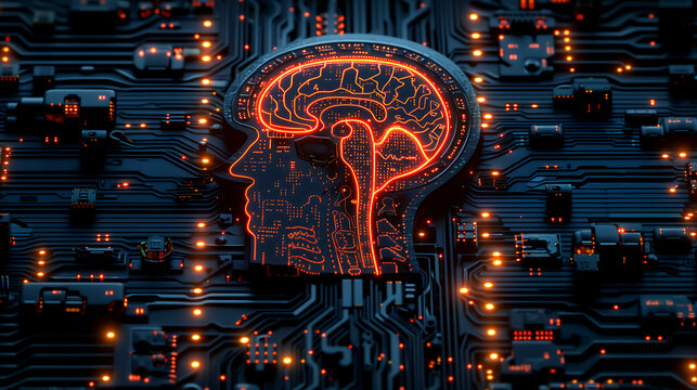 3d render of an abstract human brain with circuit patterns, illuminated in orange and black tones on the background of high-tech electronic circuits, creating a futuristic digital concept.