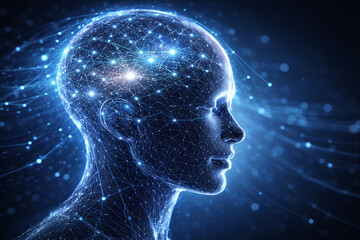 A futuristic digital wireframe head with glowing circuits representing artificial intelligence and the mind.