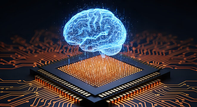 Digital brain on circuit board illustrating ai technology