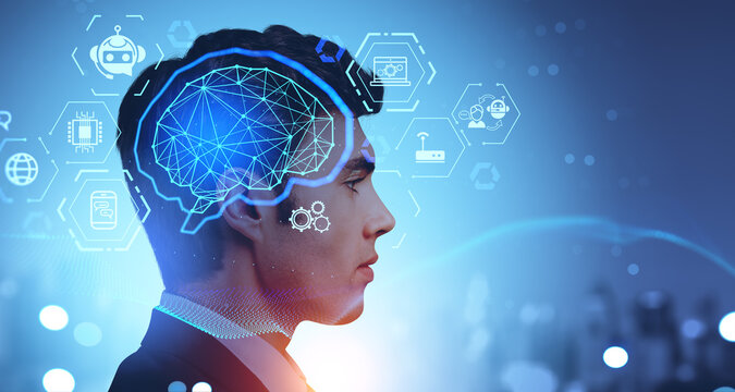 Youngster uses electronic AI brain interface with virtual AI brain and communication robot symbols, showcasing AI and blockchain technology and machine intelligence concept.