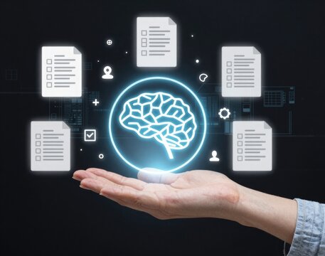 Glowing brain connected to cloud computing and data security icons on a digital interface