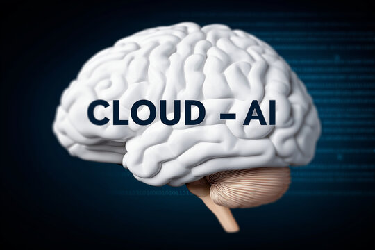 A digital rendering of a brain with the text "CLOUD - AI," symbolizing the intersection of artificial intelligence and cloud computing.