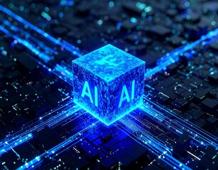 Photo of glowing blue cube with ai text on a dark circuit board background, representing artificial intelligence and technology