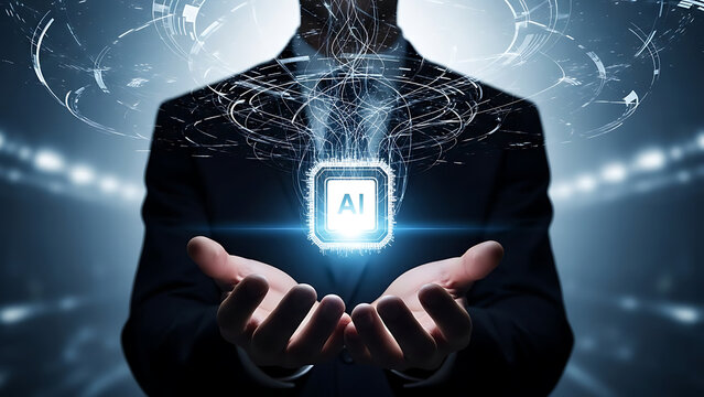 Person holding a glowing digital brain hologram with circuitry and bright neural network highlights representing artificial intelligence and advanced technology