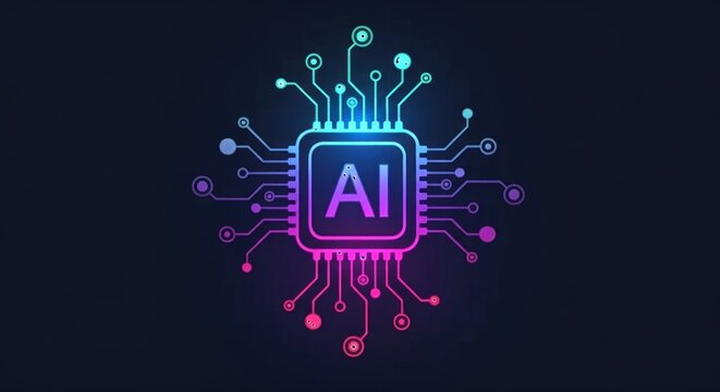 Vibrant Gradient AI Processor Microchip with Futuristic Circuitry Design on a Dark Background, Representing Artificial Intelligence and Advanced Technology