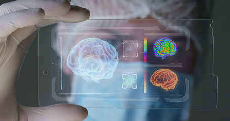 A futuristic physician, a surgeon examines a technological digital holographic plate Human brain a medical mask, a cap brown eyes Concept futuristic medicine new technologies doctors laboratory future