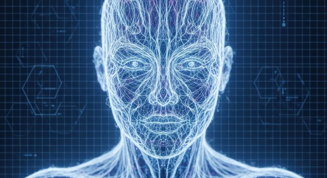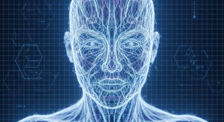 A glowing blue digital rendering of a human head and upper body, depicting intricate biological networks on a dark, grid-patterned background.