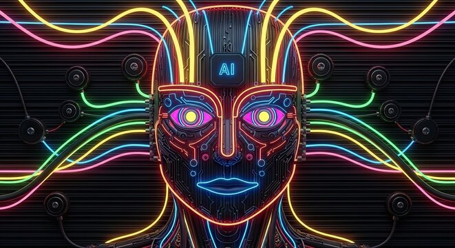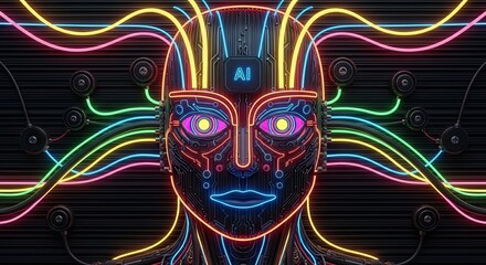 Cybernetic Awakening: A futuristic depiction of an AI face with vibrant neon lines and circuits. Capturing the essence of technology's intersection with artificial intelligence.