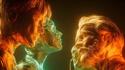 Three glowing abstract human profiles, rendered in vibrant neon wireframes, symbolizing artificial intelligence, technological connection and shared digital identity against a dark futuristic.