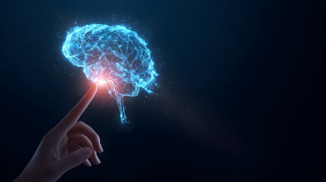 A hand touches a glowing, digital representation of a human brain in a futuristic, science-based depiction against a dark blue background.