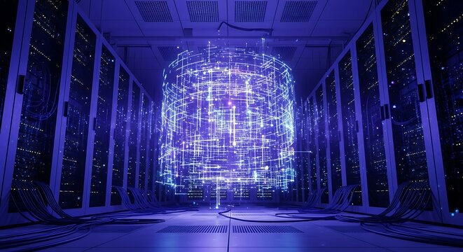 Abstract glowing neural network with futuristic light connections, holographic visualization symbolizing artificial intelligence data processing, deep learning, and machine intelligence.