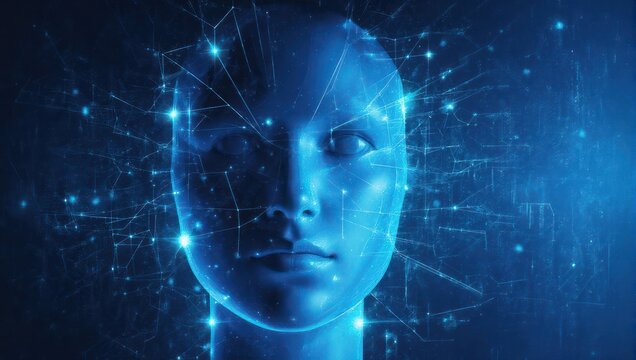 A glowing blue human face with digital circuitry overlaid, evoking technology and artificial intelligence