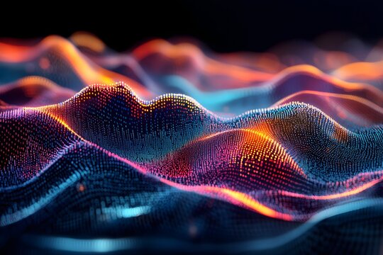 abstract digital landscape made of flowing code, terrain shaped by numbers and symbols, surreal tech world