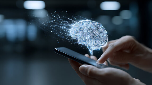 Person touching glowing digital brain hologram on smartphone hand