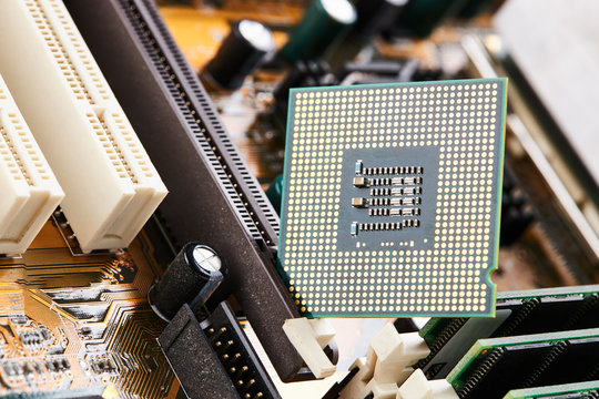 close up view for cpu or central processor chip over circuit board background. electronic industry conceptual. studio shot