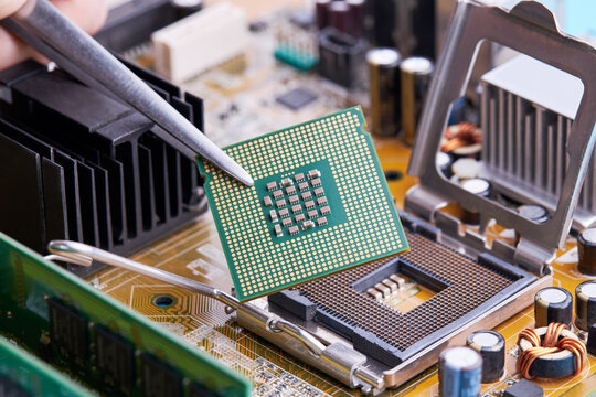 cpu processor hardware unit over wooden background. computer chip close up. digital industry concept