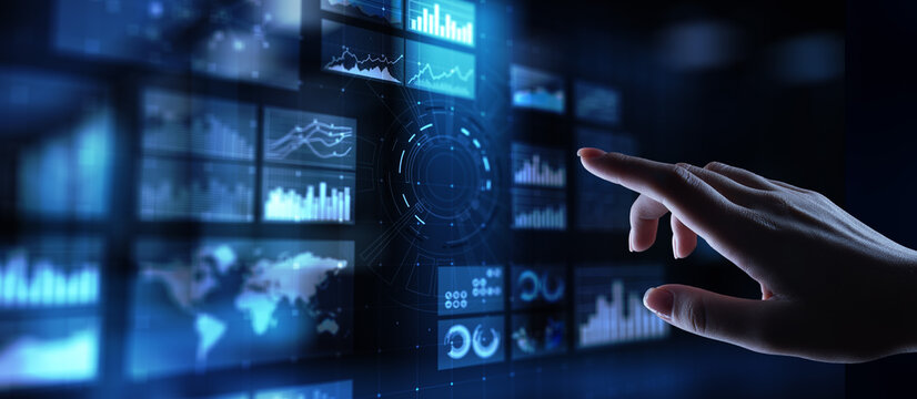 Virtual screen business intelligence dashboard, analytics and big data technology concept.
