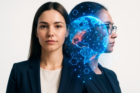 Businesswomen with digital globe interface showing global network concept on white background, illustrating innovation and tech integration in business. Ai generative