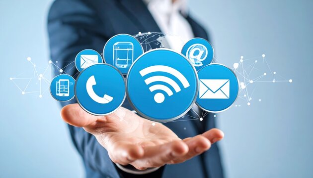 Businessman in formal suit showing digital network connections icons. Symbolizing technology integration, networking, innovation, and internet of things. Light effects and futuristic concept.