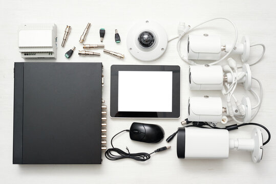 Digital tablet with blank screen, video recorder and various security cameras on the white flat lay table background.