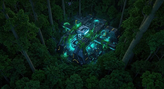 Futuristic metallic structure emitting glowing energy is partially overgrown within a dense, dark forest canopy