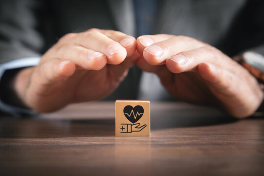 Health insurance concept. Healthcare, finance and medical service. Showing hand to protect heart pulse, heartbeat lone and cardiogram symbol on wooden cubes. Digital madical service concept