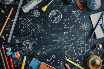 Mathematical graphs and formulas drawn in white on a chalkboard background, with some elements highlighted in bright colors