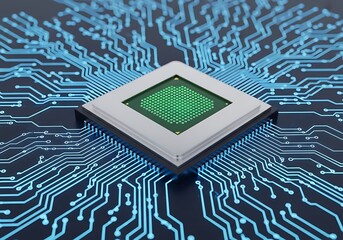 Closeup of a glowing green central processing unit cpu on a circuit board with illuminated blue data pathways, representing advanced technology and digital connectivity