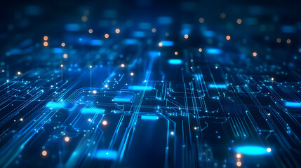 Futuristic digital data flow on circuit board with glowing blue lines, representing advanced technology and network connectivity.